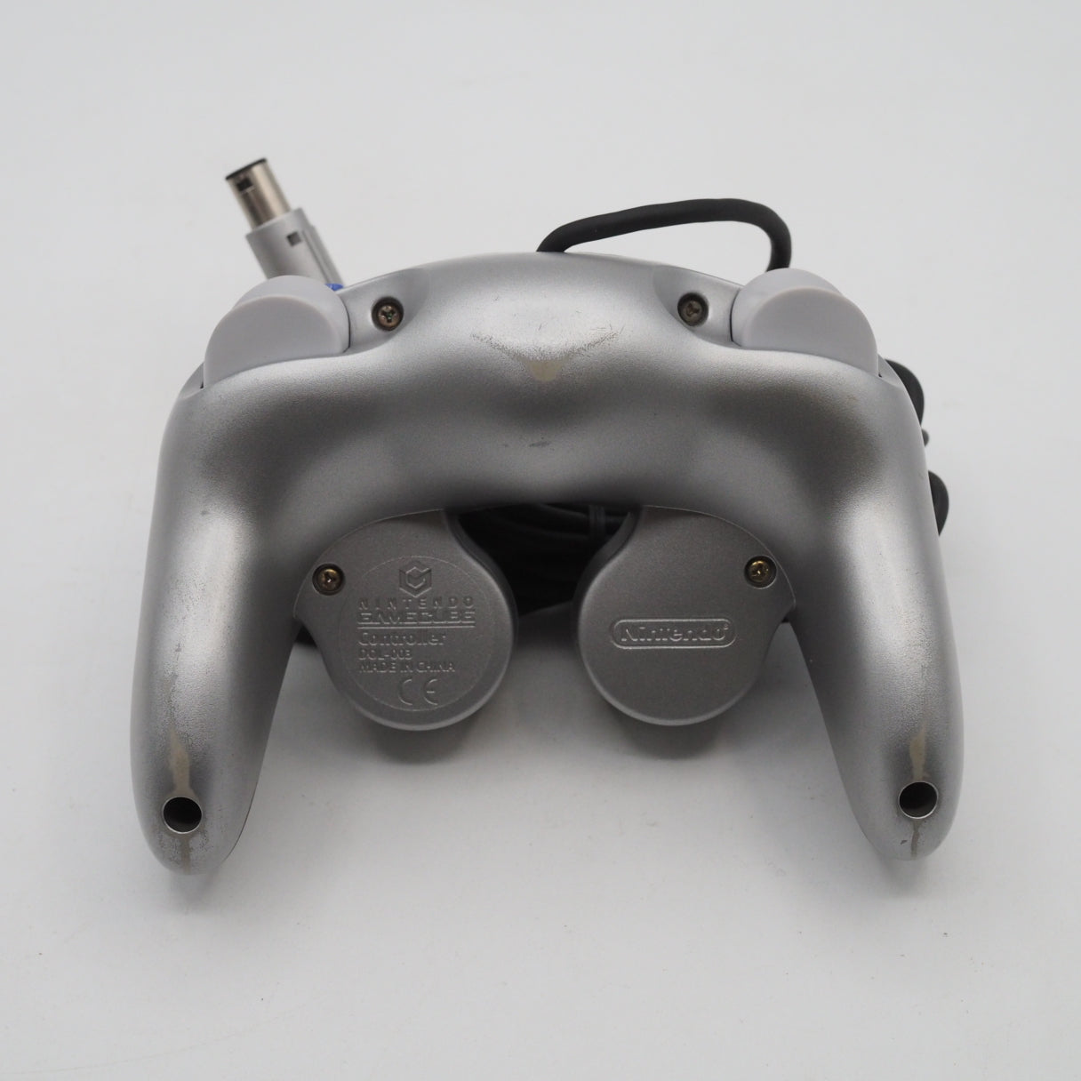 The console shows scuffs and fine scratches. The console nameplate and the Game Boy Player also show scuffs and scratches. The controller has scuffs and scratches from normal use, and the rear housing shows partial paint wear.