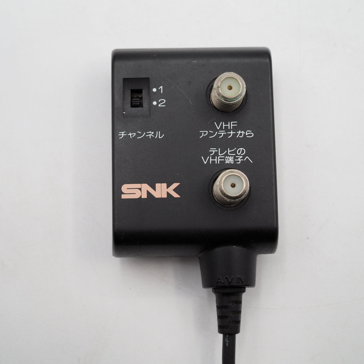 Used. Made in Japan. Official genuine SNK adapter. Used to connect a Neo Geo AES console or Neo Geo CD system to a TV’s RF (antenna/coaxial) input.