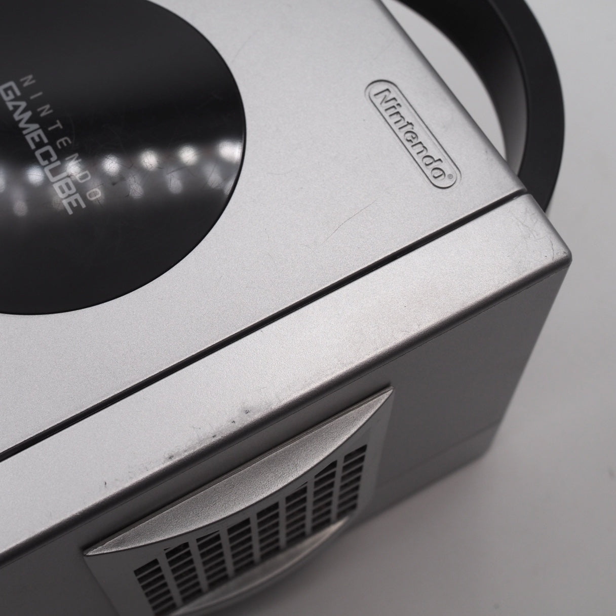 The console shows scuffs, fine scratches, and a small area of paint wear on a corner. Dust filters have been installed over the console’s ventilation openings. The console nameplate and the Game Boy Player both show scuffs and fine scratches. The controller has scuffs and scratches from normal use, and the rear housing shows partial paint wear.