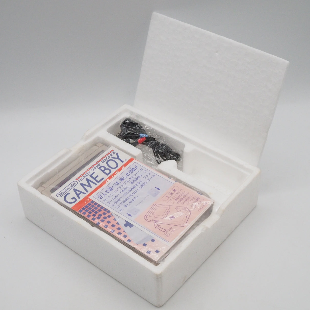 Console ×1 (Nintendo Game Boy DMG-01, Gray) / Instruction manual ×1 (matching serial number) / Additional paperwork ×1 / Sealed stereo headphones ×1 / Styrofoam insert ×1 / Retail box ×1. Batteries not included.