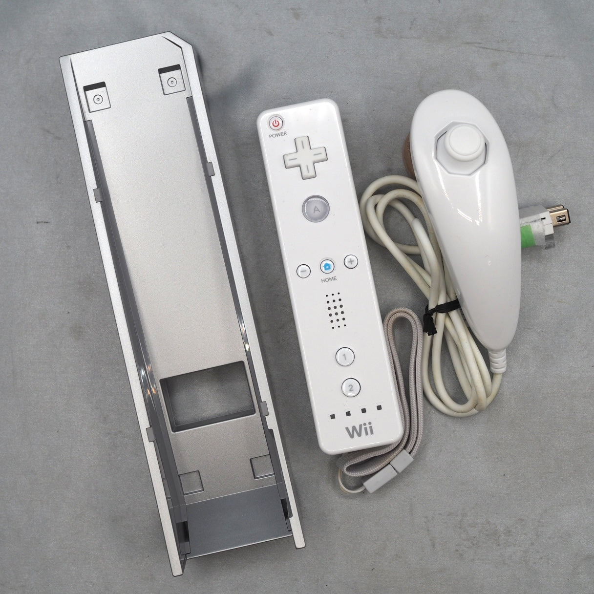 The console, Wii Remote controllers, and Nunchuk are in very good condition. Original accessories are included: Wii AC adapter, Wii AV cable, Sensor Bar, Sensor Bar stand, Wii console stand, Wii Remote wrist strap (attached to the remote), stand support plate, unused double-sided tape for the Sensor Bar, three manuals (Setup / Functions / Quick Guide), and a repair request form. AA alkaline batteries are required for the controllers.
