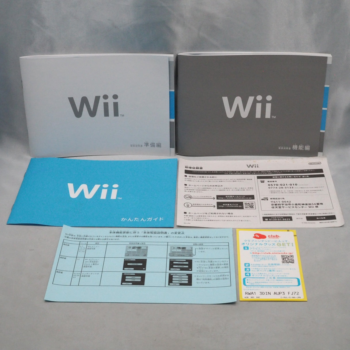 Console ×1 (Wii RVL-001) / Wii Remotes ×2 / Nunchuk ×1 / AC adapter ×1 / AV cable ×1 / Sensor Bar ×1 / Sensor Bar stand ×1 / Wii stand ×1 / Stand support plate ×1 / Wrist strap ×1 / Manuals ×3 (Setup, Functions, Quick Guide) / Repair request form ×1 / Unused double-sided tape ×1. Batteries not included.
